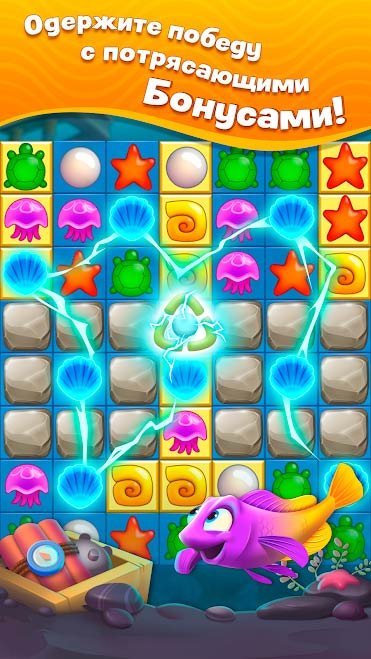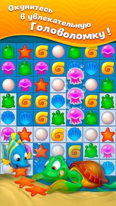- Красивая игра «три-в-ряд» с рыбками и аквариумом.