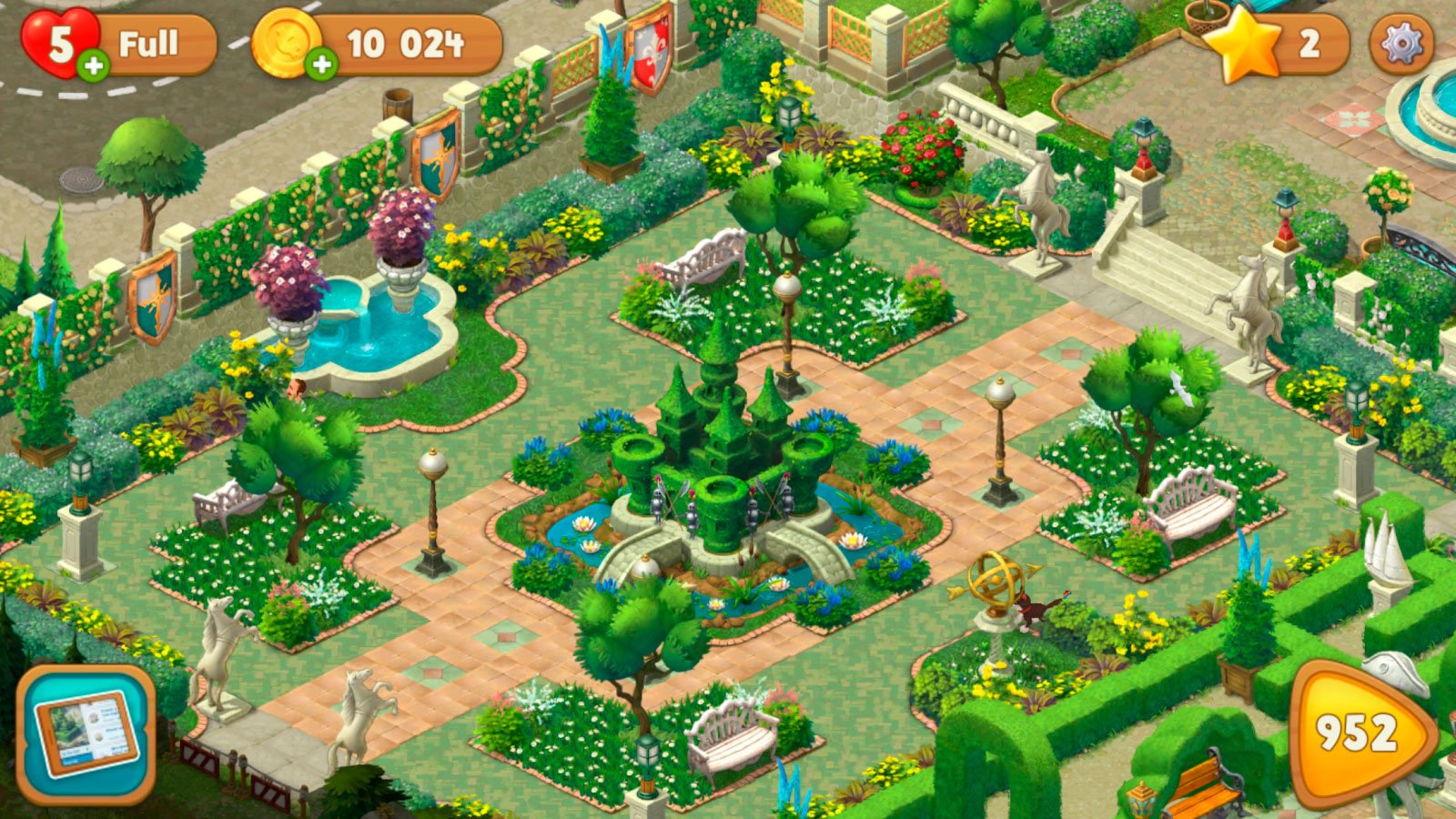 В Gardenscapes вы встретите множество забавных персонажей – знакомых вашего дворецкого Остина, соседей и т.д. Они помогут вам с восстановлением сада, расскажут много интересного и наградят ценными подарками, если вы им поможете. Также здесь у вас будут очаровательные питомцы – щенок, лошадка и кот. Вы сможете тренировать их и обучать различным трюкам.