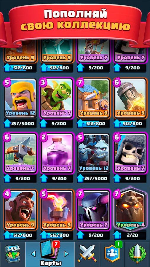В этой игре вы сможете открыть множество карт, включая хорошо знакомые из Clash of Clans и абсолютно новые. Карты выпадают из сундуков, которые вы получаете в награду за победы в боях, их также можно купить за золото. Каждую карту можно улучшить до определенного уровня, чем больше уровень карты, тем выше показатели существа или заклинания, соответствующего этой карте.