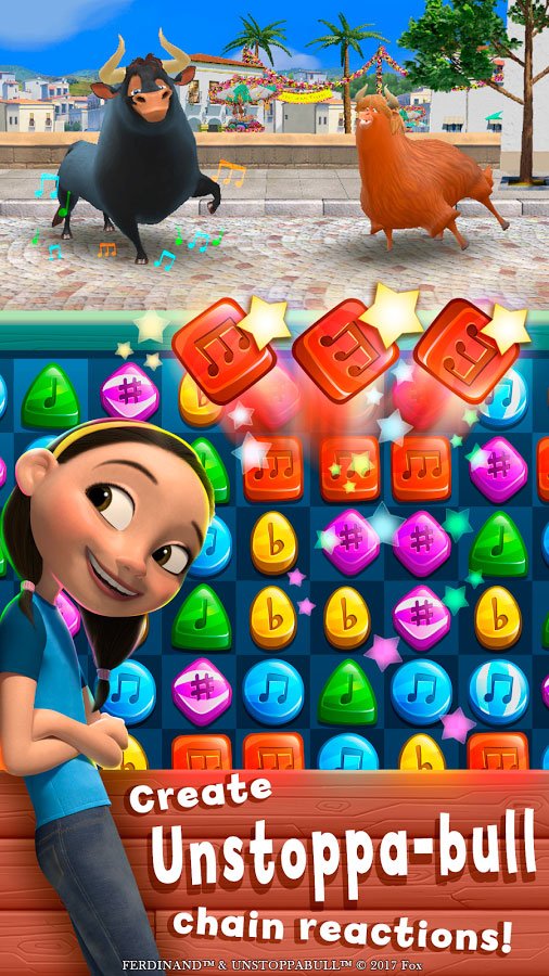 Всем известный огромный бык Фердинанд вновь готов к приключениям. Попробуйте скачать Ferdinand: Unstoppabull на андроид и окажитесь в мире красивых путешествий. Проходите огромное количество самых разных головоломок и составляйте комбинации три в ряд. Смотрите на потрясающие эффекты от которых захватывает дух. Составляйте длинные комбинации, за которые можно получить ценные бонусы. Благодаря им можно будет очистить поле и перейти на следующий уровень. Посмотрите со стороны мультика на чудесные пейзажи Испании и на танцы. Игрок сможет почувствовать радость и наслаждение от всего этого красочного великолепия.Собирайте комбинации, чтобы действовать в удивительных танцах. Игрок, который сможет скачать Ferdinand: Unstoppabull на андроид познакомится с талантливыми персонажами этого чудесного мультфильма о быке. Постарайтесь помогать им и делайте их жизни счастливыми. Вы должны стать участником грандиозного события в танцах и показать свои умения перед целым миром героев. Впереди ожидает больше ста разнообразных уровней, которые предоставят массу веселья. Вы должны решить все головоломки, чтобы душой почувствовать эти испанские ритмы и их музыку. Попробуйте создавать комбинации, чтобы создать целую цепочку действий.