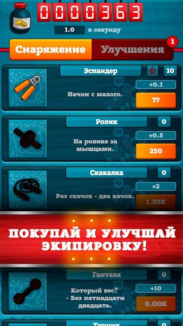 Старайтесь изначально следить за прогрессом, ведь изменяется он очень быстро. Разработчики предоставили широкое разнообразие тренажеров, которые могут помочь не только новичку, но уже и настоящему профессионалу. Улучшайте квартиру, покупайте абонемент на тренировки и еще многое другое. На самом деле, разработчики придумали все очень круто. Надеемся, что вы захотите скачать Накачай Качка на андроид и приступить к качалке вместе с центральным персонажем. Здесь вас ждет много чего крутого и интересного. Закупайте тренажеры, меняйте обстановку, соревнуйтесь с друзьями и многое другое. Графика в игре поставлена на высшем уровне, постоянно вас сопровождает красивая музыка. Делайте решения и ни в коем случае не останавливайтесь перед препятствиями. Мы уверены, что вы сможете пройти через любые преграды, какими бы серьезными они не были.
