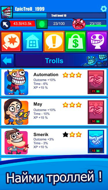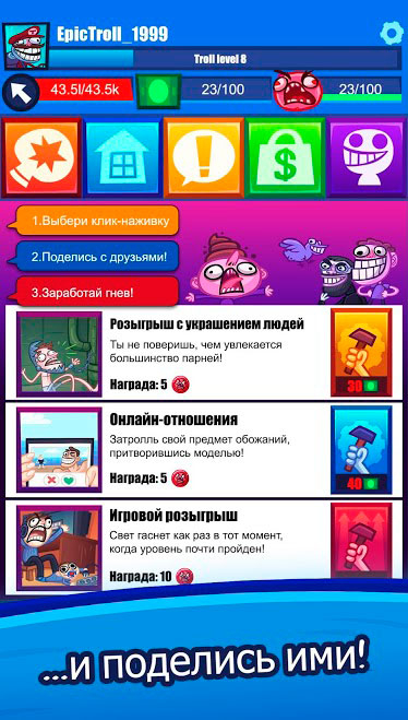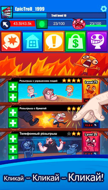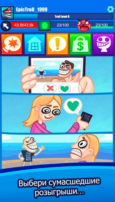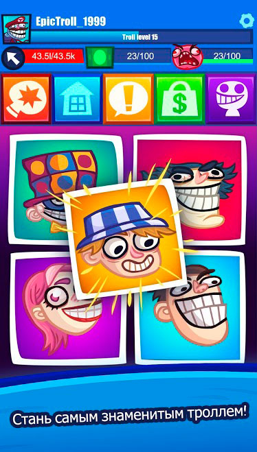 Устройте самый захватывающий троллинг и веселитесь в процессе игры. Главному герою необходимо будет разыграть своих помощников и друзей, чтобы набрать полную коллекцию смешных кликов. Игроки решившие скачать Troll Face Clicker Quest на андроид смогут даже подключиться к социальным сетям, чтобы разыгрывать своих друзей. Станьте самым непобедимым троллером в мире и устраивайте по-настоящему безумными богатеями. Вам понравится эта качественная картинка изображения, выводимая на экран и большое разнообразие розыгрышей. Поднимайтесь на новые уровни каждый день и заполучите новые награды и достижения. Почувствуйте все сумасшествие этой игры прямо сейчас.Ответы на часто задаваемые вопросы