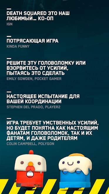 Действительно потрясающая игра, собравшая в себя уникальные элементы геймплея и захватывающие принципы действий. От игроков здесь потребуется очень много усилий умственного плана. Вместе с Death Squared легко можно стать поклонником жанра головоломок и фанатом их геймплея. Такой увлекательный игровой процесс идеально подойдет как детям, так и взрослым. Решайте эту потрясающую головоломку и прилагайте максимум усилий, пока не доберетесь до лучшего места в рейтинге. Вас ждут самые сложные испытания и ловушки, требующие координации и силы реакции. Сыграйте вместе с другом в этом увлекательном приключении и наслаждайтесь.Скачать Death Squared на андроид бесплатно