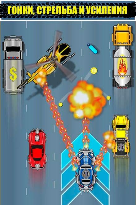 В этих сумасшедших гонках самым важным будет не только развивать невероятно быструю скорость, но и уничтожать своих соперников при помощи пуль и огня. Больше десятки оригинальных видов вооружения, которое можно будет установить, доступно гонщикам из Дорожные войны. В погоне за увеличением огневой мощи своего транспортного средства не стоит забывать про улучшение качеств обороны. Поставьте туда самую лучшую броню в мире и прокатитесь на разных тачках. Игроки могут собрать достаточно большой гараж из транспортных средств, где будет спорткар, ракетная тачка или любая другая, не существующая в реальности. Естественно, что на дорогах не вы один сможете стрелять, потому что Дорожные войны предусматривает жестоких соперников. Старайтесь увиливать от летящих в вас ракет и тогда можно рассчитывать на успешное окончание заезда. После каждой победы в гонке игроки получат монетки, которые станет реально потратить на покупку нового оружия или вовсе тачки.