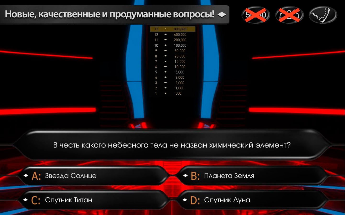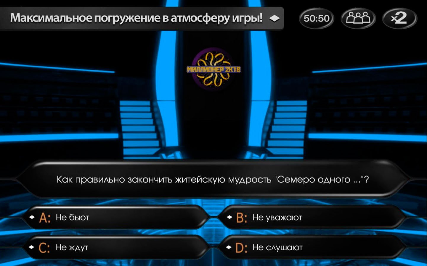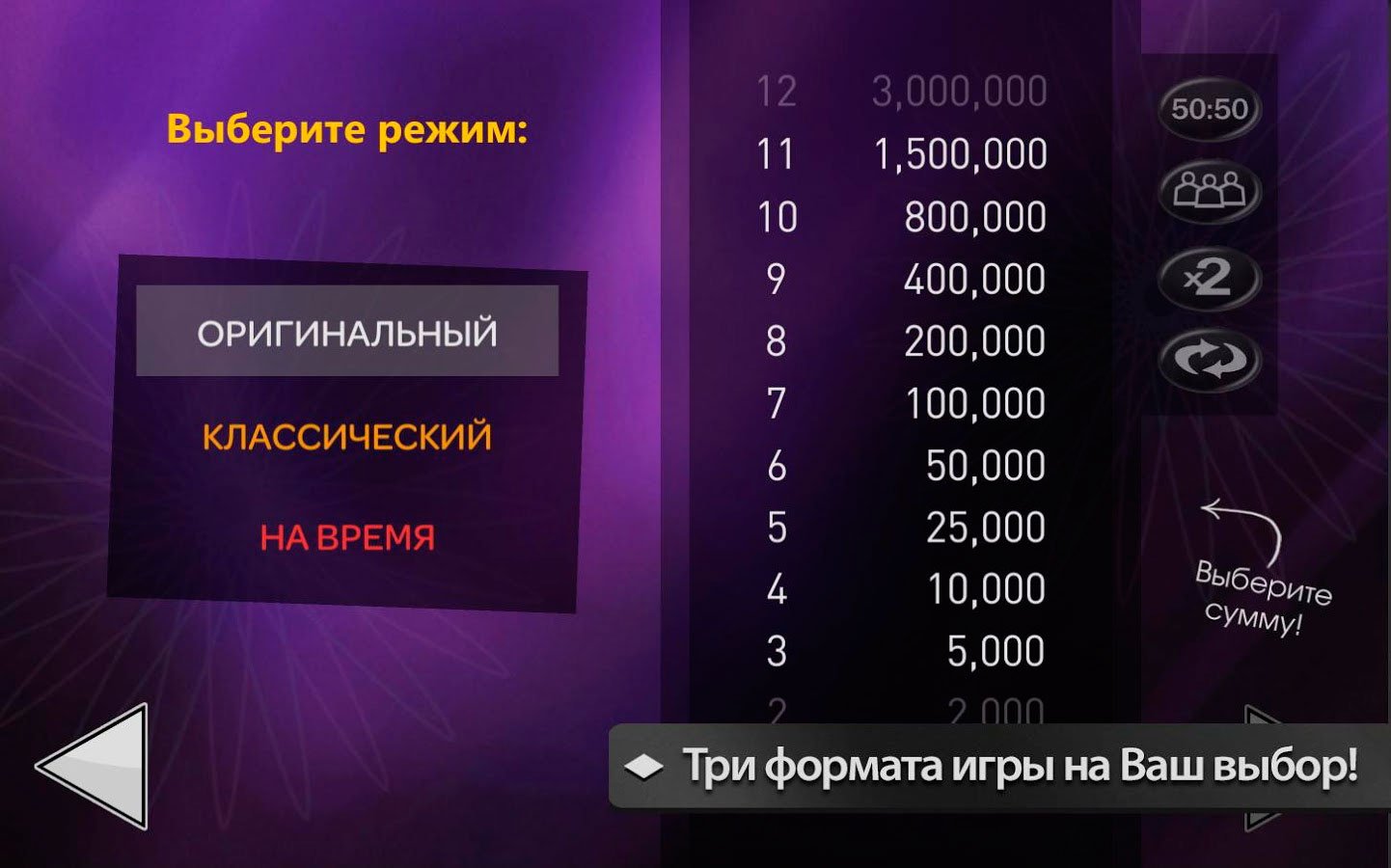 Будущий миллионер сможет выбрать один из трех предложенных режимов игры, где каждый по-своему интересен. Выбирайте любой, в котором хотите проверить свои навыки и способности. Разработчики постарались создавать уникальные вопросы, которых не найти в других викторинах. Также они смогли воссоздать самую реалистичную атмосферу на популярном шоу, и игрок окунется в эти соревнования с головой. Улучшайте свою статистику и получайте достижения. Делитесь ими с друзьями и используйте три доступные подсказки. Позвоните другу или воспользуйтесь помощью зала в трудный момент.Ответы на часто задаваемые вопросы