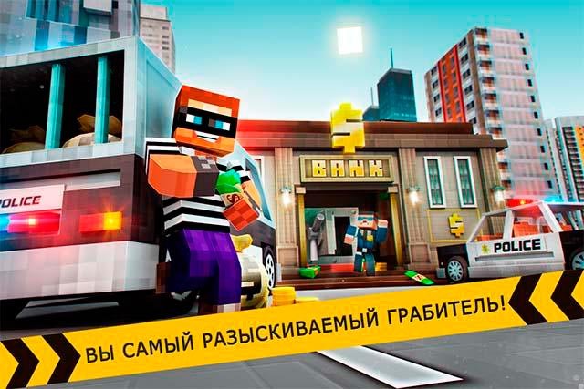 Грабитель Полиция Гонки Ограбить Вор – это увлекательный экшен в пиксельной кубической графике, где игрок примет сторону преступного мира. Тогда можно будет готовиться к грабежам банков и перестрелкам с копами.