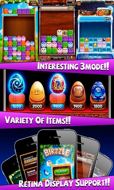 Birzzle – это совершенно обновленный бренд жанра головоломок три в ряд, где игроки смогут собирать в комбинации блоки и побеждать. При помощи своих же пальцев игроки смогут собирать из пушистых птичек комбинации и выигрывать призы.