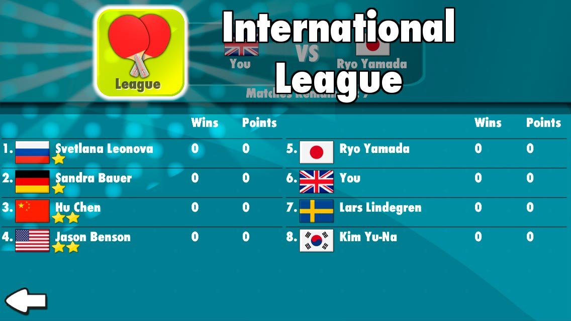 В настольном теннисе на мобильных играют миллионы пользователей по всему миру, и каждый из них будет представлять свою страну. Попробуйте вывести свою к небывалой славе и завоюйте мировую популярность. Побеждайте соперников и зарабатывайте очки, которые помогут вам занять лидирующие позиции в рейтинге всех национальных команд. Можно представлять на мировой арене Настольный теннис 3D абсолютно любую национальную команду. Добывайте новые достижения и покачивайте свой уровень мастерства до абсолютного профессионала. Если игрок будет соревноваться с компьютерным интеллектом, тогда в любой момент матч может быть остановлен, и продолжить его вы сможете в следующий свободный момент.
