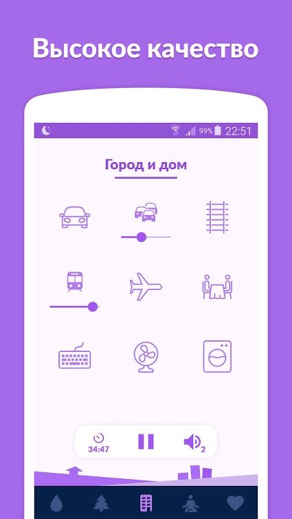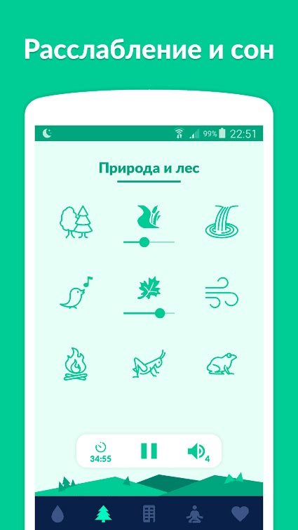 Огромное количество самых разнообразных музыкальных звуков станет доступно вам, и их можно будет воспроизводить в невероятно высоком качестве. Каждая из присутствующих здесь композиций создана для одной цели – помочь пользователям расслабиться и заснуть крепко и сладко. Вместе с Sleepo: расслабление и сон вы перестанете задумываться о бессоннице и будете засыпать моментально. Каждый по-своему воспринимает расслабляющие моменты, поэтому можно будет простыми касаниями выбрать, под какой из звуков вы будете засыпать сегодня. Например, можно включить звуки льющегося дождя, отголоски природы, городской суеты или любых других разделов. Если вы не желаете чтобы после сна музыка продолжала работать, ведь она может посадить вам батарею. Тогда в Sleepo: расслабление и сон есть специальный таймер, включив который мобильное устройство отключится в автоматическом режиме. Отличная особенность данного приложения заключается в отсутствии интернета, а это означает, что ни о чем думать не нужно.
