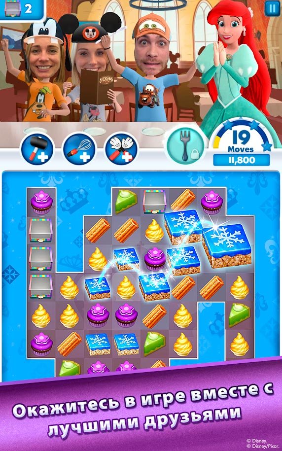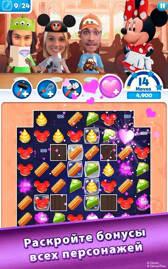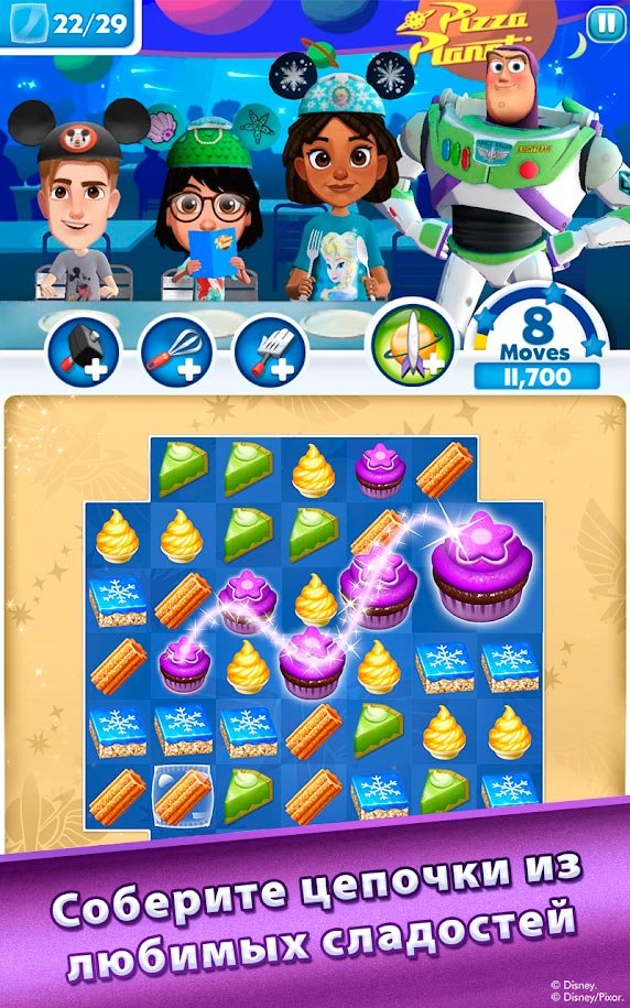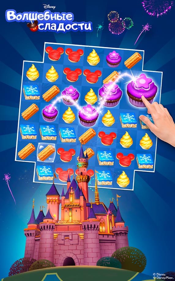 Волшебные сладости – это очень веселая мобильная игра для детей, которая также может понравиться взрослым. В ней собралось невероятное количество разных мультгероев из вселенной Дисней.