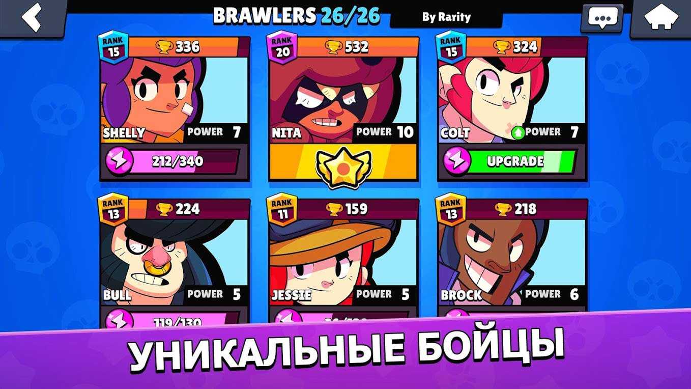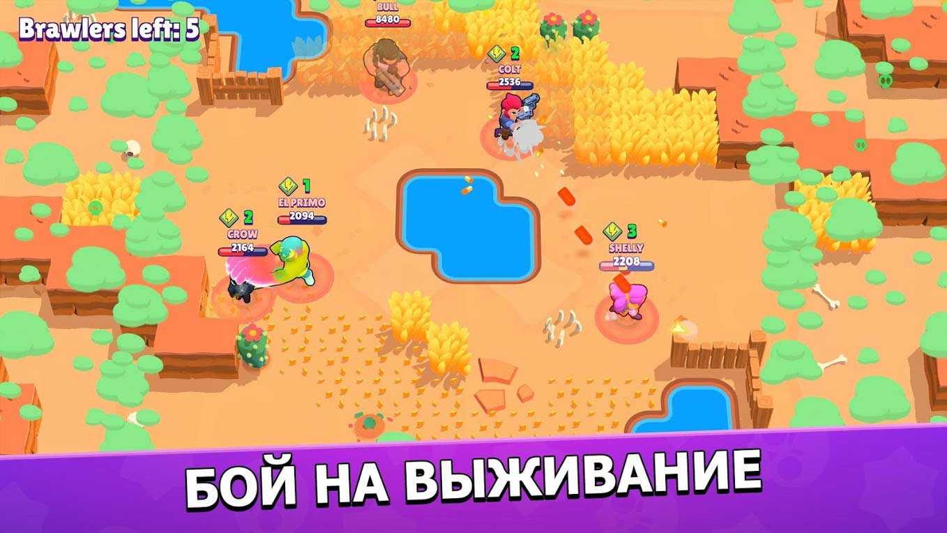 В игре есть множество персонажей, каждый из которых имеет собственный стиль боя и различные особенности. У любого героя есть обычная атака и специальная способность, которая наносит огромный урон, но ее нельзя использовать часто. В приложении есть интересные режимы игры: динамичные бои 3 на 3 за звезды или кристаллы, захват сейфа с сокровищами, эпичные битвы с боссами и др. Отдельного внимания заслуживает режим выживания («Королевская битва») с участием 10 героев, а так же Броулбол – жесткий футбол без правил.
