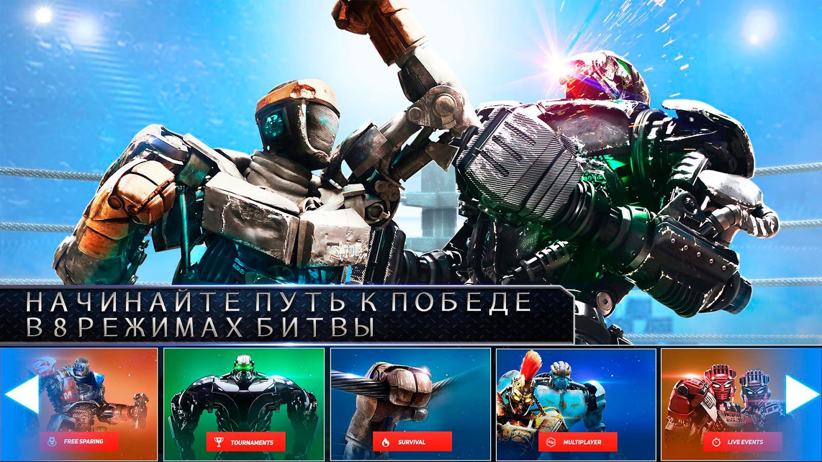 Уже сейчас если скачать Real Steel на андроид можно будет выбрать своего робота из 65-ти доступных. У каждого не только оригинальные внешние данные, но и свои исключительные способности, использовать их можно будет в полной мере. Игрок сможет пройти самый крутой эпизод из фильма, когда в противостоянии на ринге сошелся Атом и Зевс. Это будет потрясающая битва, от которой у игрока захватит дух. Выбирайте один из доступных игровых режимов, среди которых есть битва в командном режиме, испытания и турнир на выживание. Все это позволит получить массу приятных эмоций и удовольствия.
