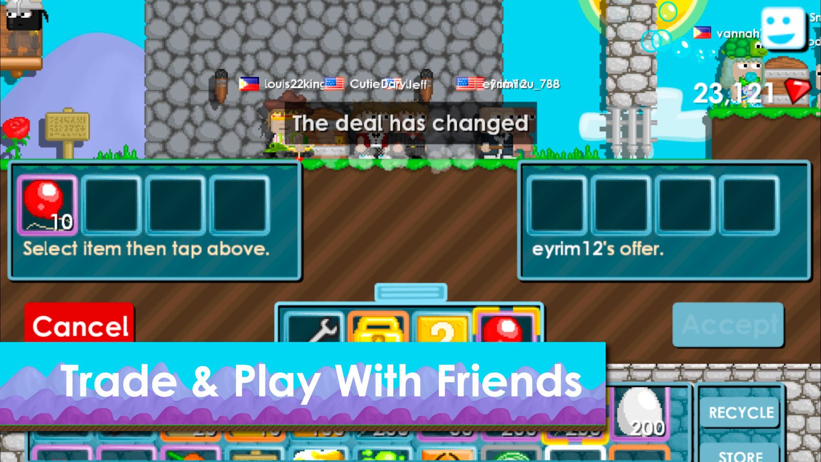 Игрок, который решит скачать Growtopia на андроид, получит возможность заниматься творчеством и с его помощью строить огромное количество разнообразных объектов. Например, можно будет заниматься строительством своего собственного шикарного дома или обустройством подземелья. Делайте настоящие шедевры, от которых без ума будут не только ваши друзья, но и вы сами. Вас ждет огромное количество широких возможностей, от которых действительно захватывает дух и поднимается настроение. Начинайте работать с реальными игроками со всего мира и взаимодействуйте.