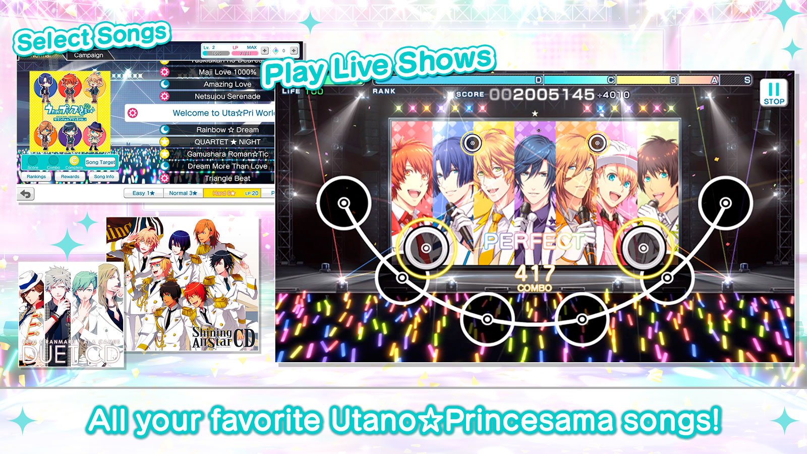 Получайте удовольствие этой потрясающей музыкальной игры вместе со своими любимыми героями. Почувствуйте особенный ритм, когда сможете скачать Utano Princesama: Shining Live на андроид и научитесь управлению с особенно отзывчивым интерфейсом. Вас ждет приятное знакомство с челнами знаменитой танцевальной команды, которые будут принимать главное участие в этом игровом процессе. Среди них есть молодые современные танцоры, и даже ветераны этого мастерства. Больше одиннадцати звезд обладающих своими умениями и навыками, которые помогут им превзойти соперников. Следите не только за тем, как действуют на сцены, но и за их жизнью вне профессионального режима.