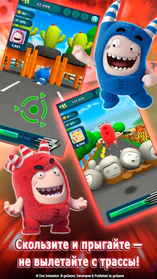 Теперь же вам недостаточно просто смотреть его, потому что можно поиграть вместе со своими героями и попробовать помочь им в прохождении проблем. Это очень веселые персонажи, которые заставят смеяться абсолютно каждого. Вместе с ними можно бесконечно долго путешествовать и выполнять крутые спринты, а также прыгать. Просто проводите по экрану пальцем, чтобы быстро разобраться с очередной проблемой и побежать как можно дальше. Вас будут ожидать очень забавные моменты, взятые из мультсериала. Oddbods Turbo Run полна локаций и знакомых врагов. попытайтесь разобраться с каждым в процессе, чтобы не помешать маленьким героям. Чтобы ускориться, нужно пользоваться подготовленными бонусами, ведь они помогут ускориться и продвинуться по системе глобального рейтинга.