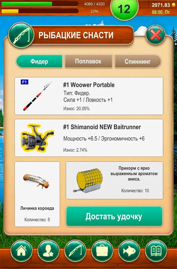 - Разнообразие удочек и снастей;