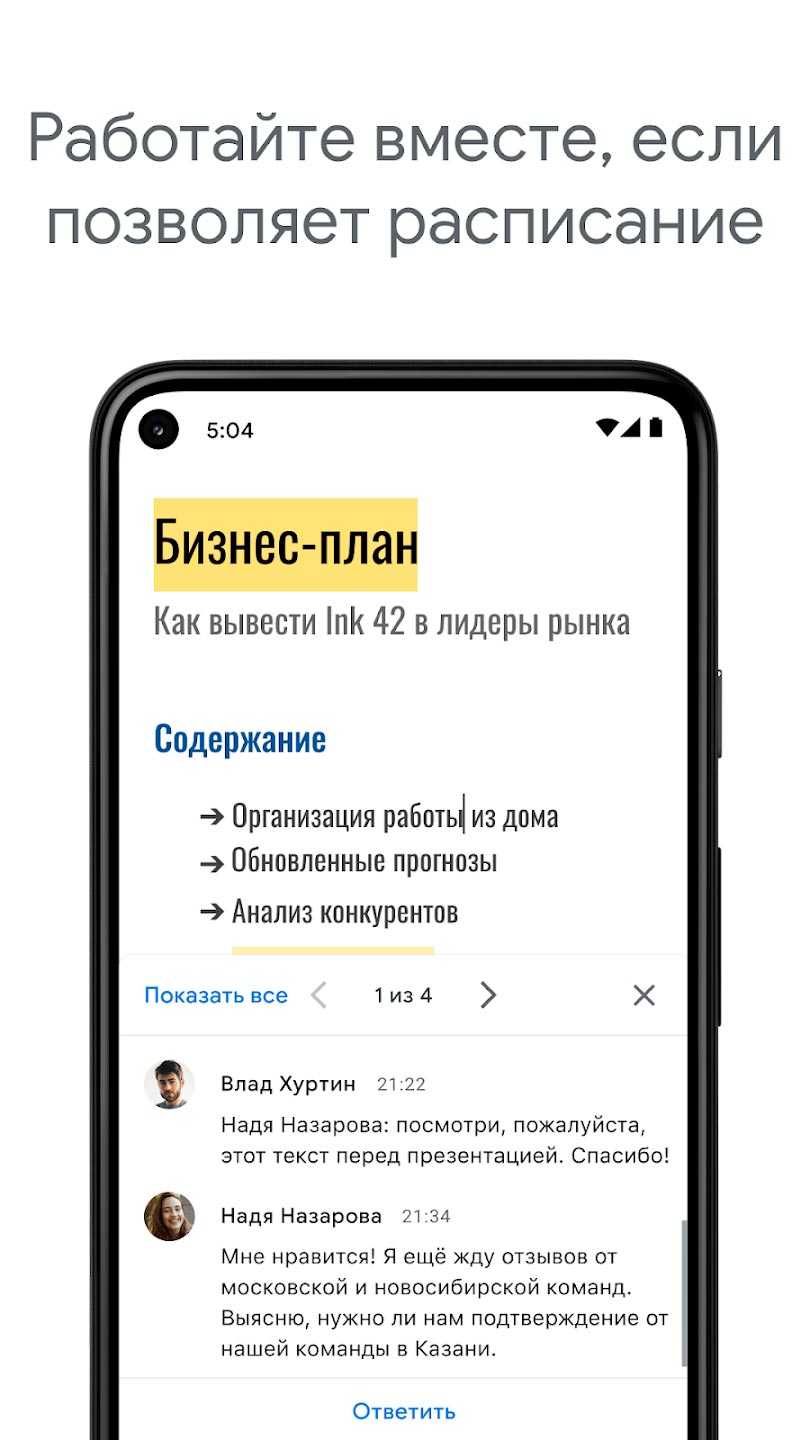 Если у вас появится на телефоне такой нужное и полезное приложение тогда можно будет забыть о проблемах с работой вовсе. Создавайте самостоятельно в любой необходимое для этого время любые типы документации или редактируйте уже имеющиеся. В тот момент, когда вы будете находиться в поездке, а вам срочно нужно будет исправить материал, просто войдите в программу и запустите рабочий процесс. Откройте доступ к огромному количеству функций и приглашайте своих коллег, тогда с этим материалом сможет работать сразу вся группа. Очень важно, что для работы с Google Документы, не нужно иметь подключение к интернету. Добавляйте к записям комментарии и их увидят все ваши сотрудники. Это очень удобно и результативно скажется на работоспособности.