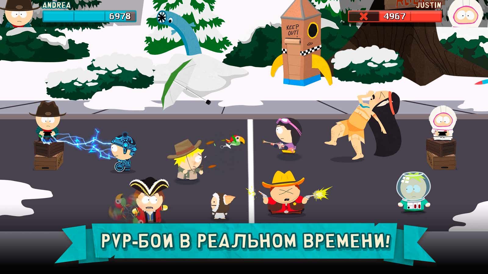 Вы долго ждали момента, когда сможете принять участие в уникальном игровом процессе на стратегическом уровне вместе с веселыми героями мультфильма. Попробуйте скачать South Park: Phone Destroyer на андроид и примите участие в этом уникальном событии, которого все так с нетерпением ждали. Это действительно разрушитель мобил, который позволяет принимать участие в поединках, проходящих в режиме реального времени. Вы сможете выбрать любого из оригинальных героев этого популярного мультсериала и вступить в схватку с другими героями. Вызывайте на поединки онлайн игроков и бросайте вызов Кенни, Кайлу и другим участникам этой сумасшедшей комедии.