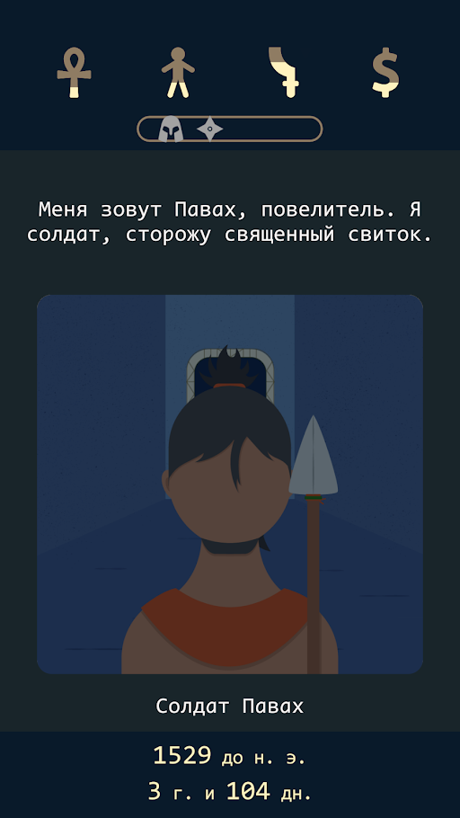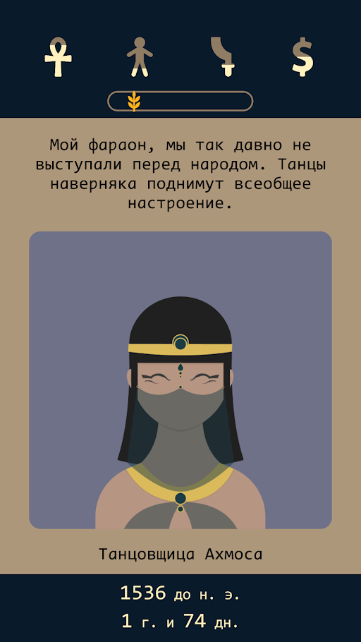 В этой игре главному герою предстоит оказаться в Египте времен 1750-х. В это время страна хранила много тайн и загадок, которые не под силу объяснить нынешнему человеку. Благодаря вашему участию в эту эпоху, можно пройти путь от самого фараона и попытаться изменить будущее страны. В текстовой игре собрано множество разных вопросов и задач, с которыми пользователям необходимо будет справиться.