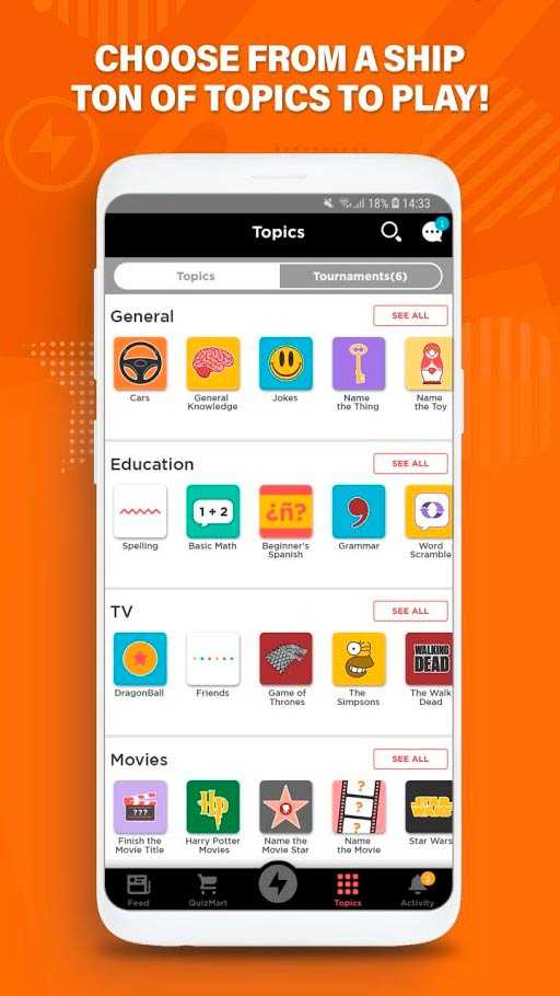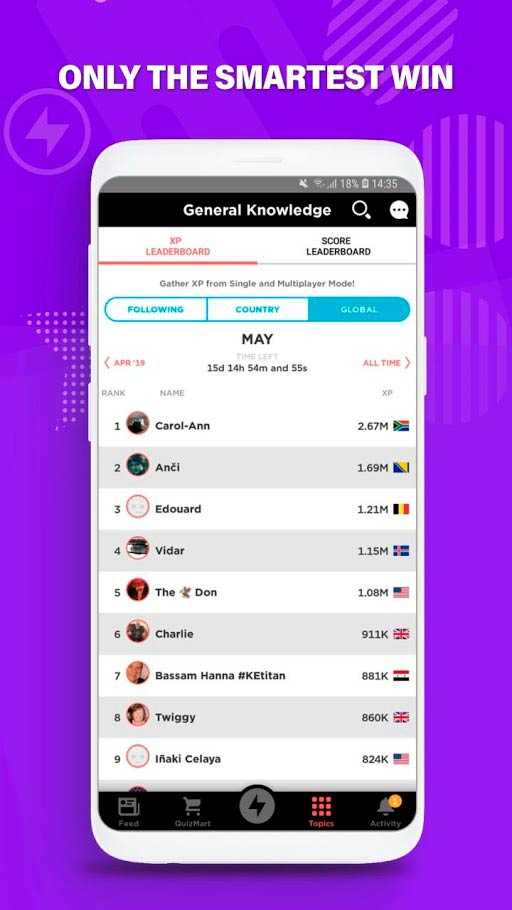 QuizUp – это увлекательнейшее приложение, которое уже успело понравиться миллионам пользователей по всему миру. Здесь вы отыщите множество похожих по интересам людей и сможете сыграть вместе с ними. Доступно более тысячи тем, так что каждый найдет что-то интересное. В таком ярком сообществе легко завести друзей и весело провести время. Правила викторин одинаковы, а их результатами всегда можно поделиться со всеми онлайн. Каждый день аудитория приложения увеличивается, проводятся турниры, открываются новые темы и происходит еще множество других интересных моментов в этой яркой социальной игре.