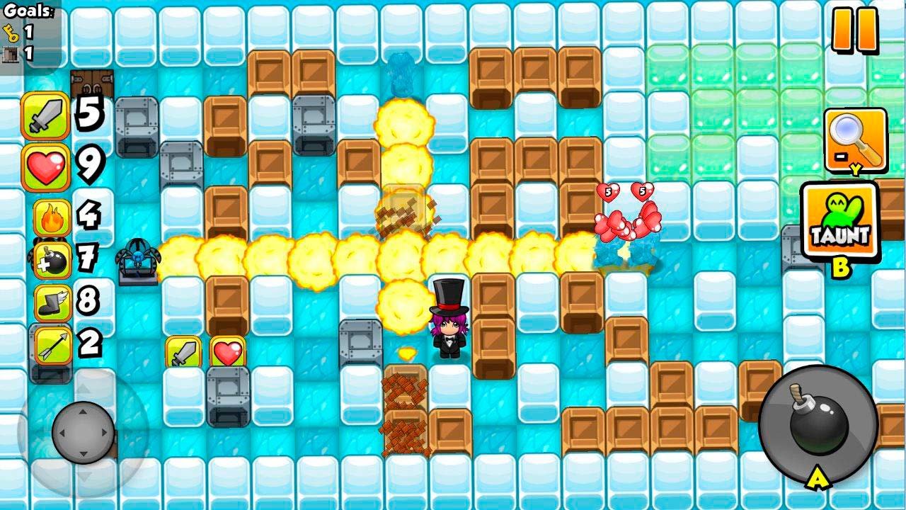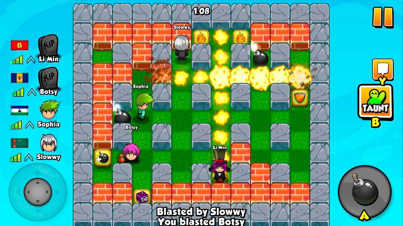 Чтобы получать преимущество над друзьями, которые тоже смогли скачать Bomber Friends на андроид, необходимо продвигаясь по полю боя собирать огромное множество бонусов и мощных боб, чтобы добиться величайшей победы. Пользуйте разрывными гранатами и уничтожайте своих друзей с помощью распространяющихся на длинные дистанции взрывных волн. Даже когда ваши друзья смогут подорвать героя, вы не должны отчаиваться, а можете продолжать мешать им жить в этом мире. Став призраком игрок может проводить крутые заклинания и тем самым портить игру друзьям.