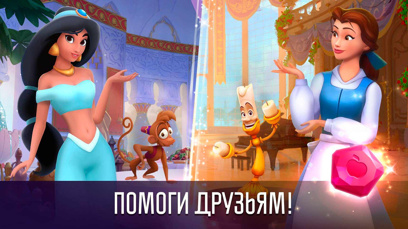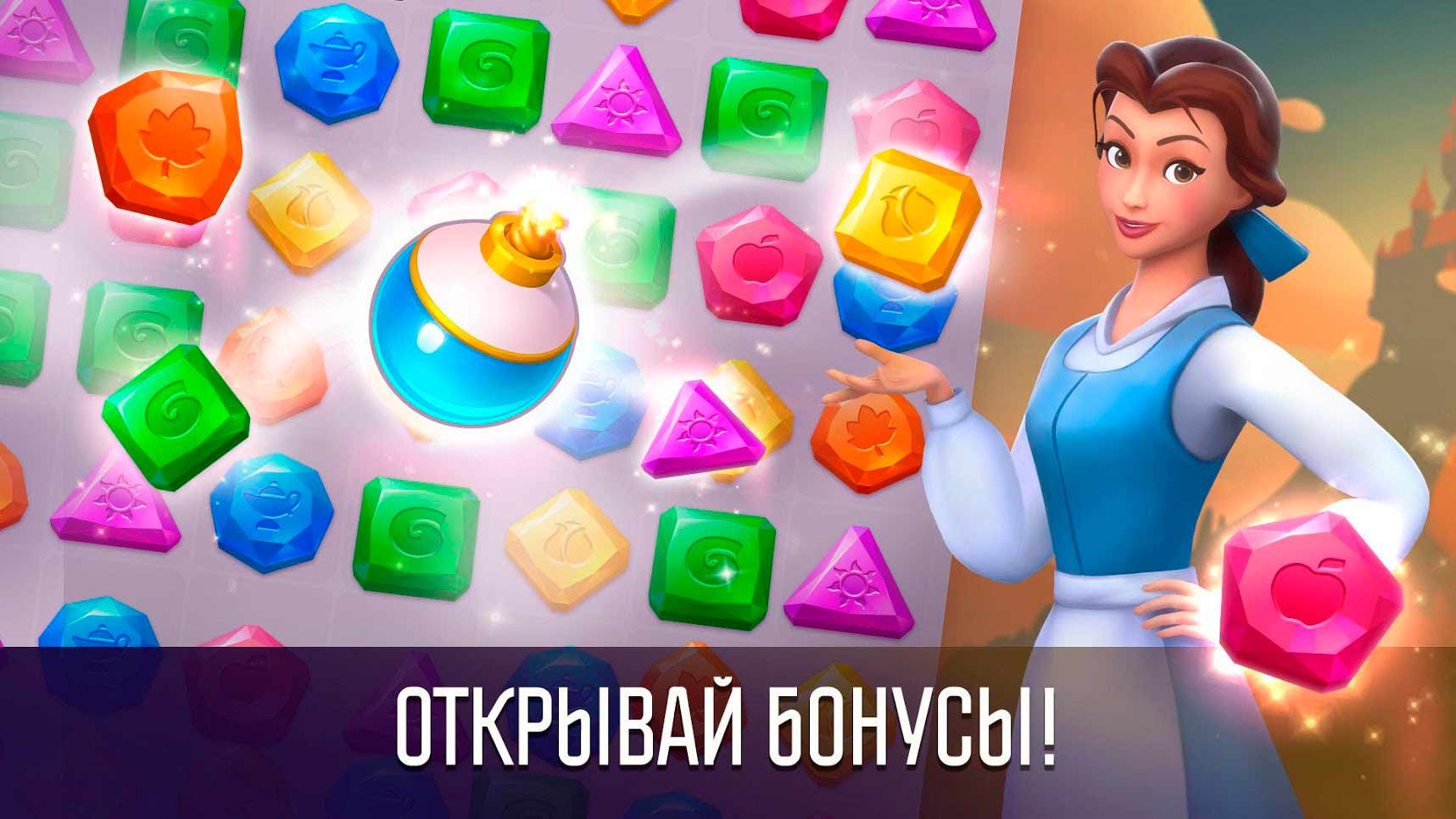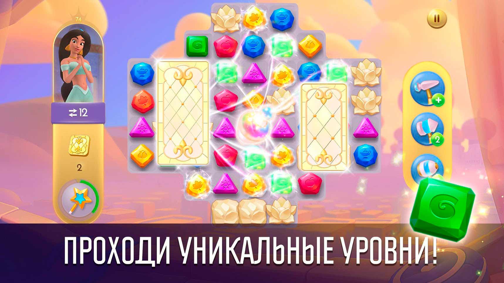 Принцесса Disney Магия загадок – это красивейшее приложение с классической механикой «три в ряд», которое особо понравится женской половине игроков. Здесь вы будете исследовать удивительный сказочный мир вместе с прекраснейшими диснеевскими принцессами. Недавно волшебная буря разрушила их королевства, и вам нужно помочь девушкам отстроить их родные дома. Разгадывайте занимательные загадки, собирайте подсказки, ценные ресурсы и просто отлично проводите время в игре.
