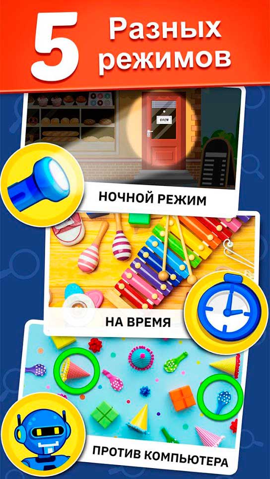 Определите отличия – это увлекательная игра в известном всем жанре, где вам нужно отыскать несоответствия на двух вроде бы одинаковых картинках. Порой отличия найти совсем непросто, и на этот случай в приложении предусмотрены специальные инструменты и подсказки. Воспользуйтесь лупой или фонариком, чтобы лучше разглядеть самые мелкие детали. Для всех ценителей подобного жанра приложение предусматривает разные режимы, в которых вы сможете проявить все свое мастерство и найти самые трудно улавливаемые несоответствия.