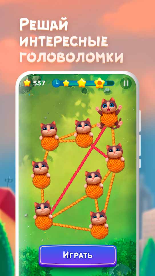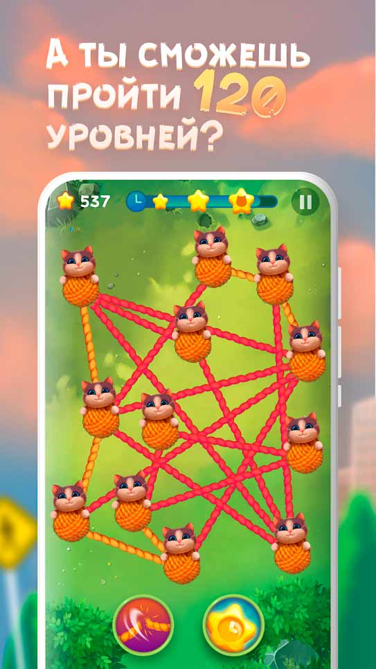 Tangled cats – это забавная головоломка для мобильных устройств, в которой вам придется распутывать запутавшихся в клубках котиков. В игре сотни уровней, для их прохождения необходимо убирать пересечения красных ниток. Такие логические задачки понравятся всем любителям проявить свои умственные способности. Разгадайте все загадки, и перед вами откроется удивительная история Кэттауна.