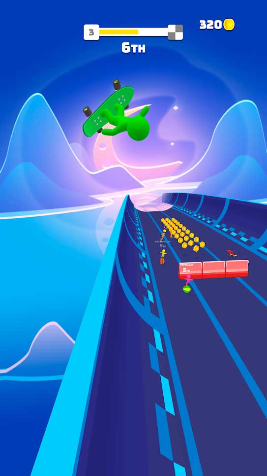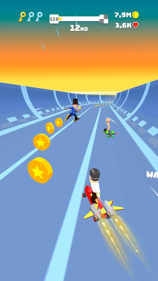 Turbo Stars – бесконечная гонка по крутым и захватывающим трассам. Преодолейте огромное количество препятствий, крутитесь, прыгайте, пригнитесь и выполните любые действия перед победой. Сражайтесь против самых лучших профессионалов, постарайтесь доказать свое превосходство и займите лидирующее место в списке игроков по всему миру. Вас ждут 10-ки удивительных и фантастических трасс, с каждым уровнем сложность будет увеличивать. Воспользуйтесь дополнениями, например, усаживайтесь за реактивный скейт, установите на него турбо и соберите как можно больше монеток, чтобы потом их потратить на бонусы.