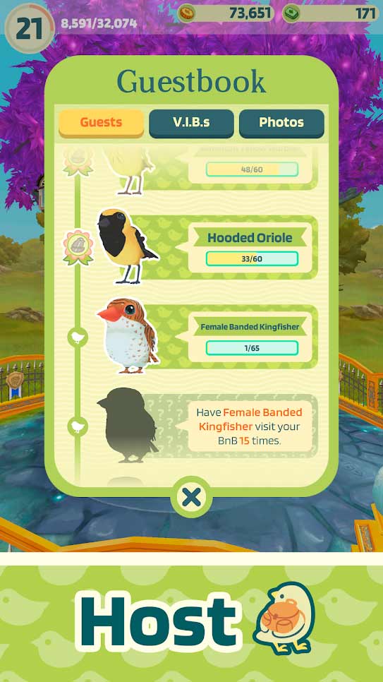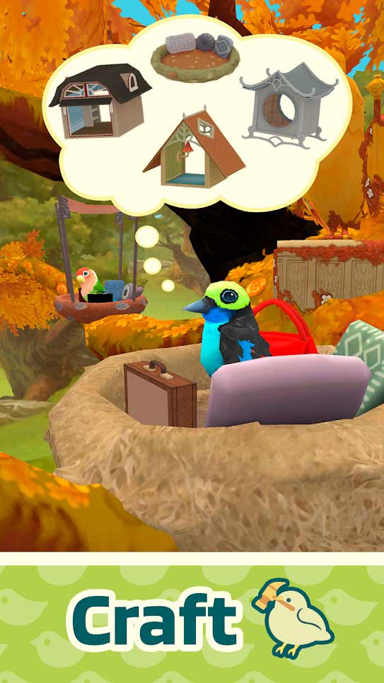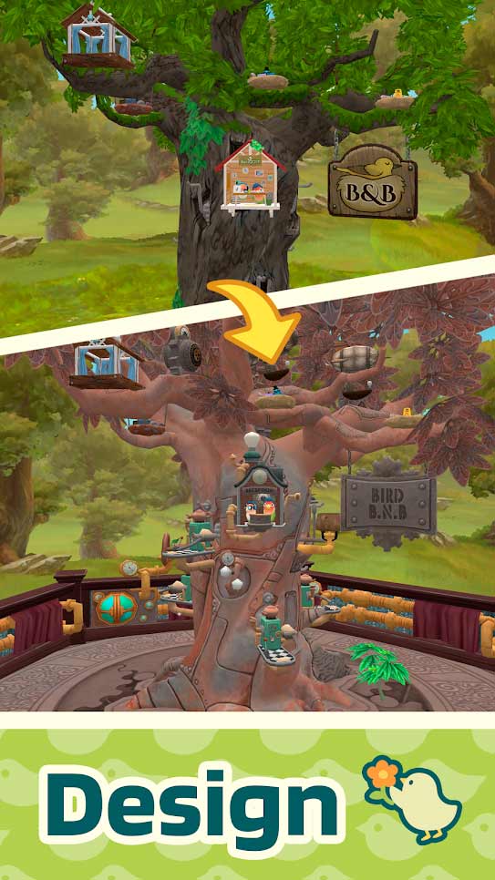 Bird BnB – приятная мобильная игра, которая отвлечет от рутины и поможет расслабиться. Занимайтесь своим ремеслом, увеличивайте рейтинг умений и соберите как можно больше птичьих питомцев для себя. Создавайте для них уютные комнаты, займитесь интерьером и пригрейте новое гнездо. На каждом дереве будут жить птицы, развивайте его до 5 звездочек. Собранные в игре птицы взяты из реально существующих видов, вы должны с ними познакомиться и даже дадите имена. Отдельная графа позволяет узнать полное описание породы, с ее характеристиками, внешним видом и умениями. Наслаждаться такой интересной игрой вы будете бесплатно, и это радует.