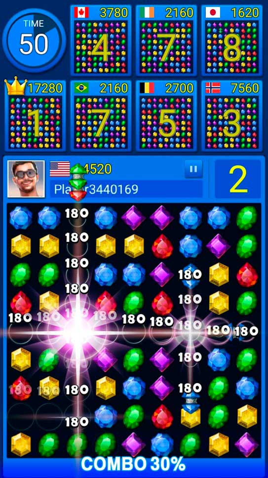 Jewels Battle – классические матчи 3 в ряд с драгоценностями и добавленным режимом с мультиплеером. Простота управления и веселые уровни ждут вас уже здесь, наслаждаться такой головоломкой можно бесконечно, здесь больше 1000 уровней три в ряд. Играйте против ИИ или устраивайте соревнования со случайными пользователями в сетевом режиме. За успешно собранные комбинации получайте призы, очки и бонусы, чтобы улучшить свои результаты. Соединяйте больше 4-х одинаковых драгоценностей в одном ряду, чтобы выиграть специальный предмет. Ежедневно посещай игровой процесс, чтобы получать специальные подарки. Наслаждаться головоломками вы можете даже без интернета, и с любого устройства на мобильной платформе.