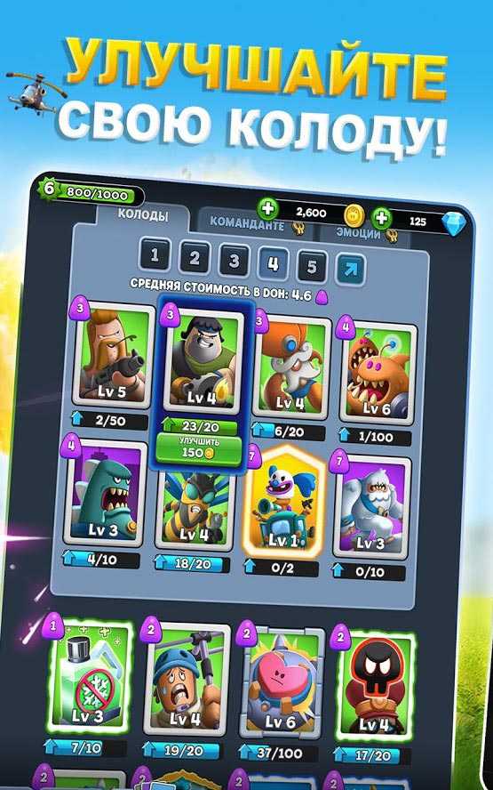 World War Doh – это увлекательная карточная стратегия для мобильных платформ, в которой вас ждут эпичные баталии и яркие персонажи. Управляйте командой отважных бойцов, побеждая противников при помощи искусного планирования и грубой силы. Создайте непобедимую колоду и уничтожьте кучу врагов, чтобы стать настоящим героем в этой удивительной виртуальной вселенной. Докажите другим игрокам свое превосходство и завоюйте их базы. Участвуйте в забавных сражениях и наслаждайтесь сказочной атмосферой приложения и его высочайшим качеством.