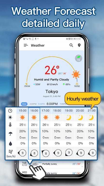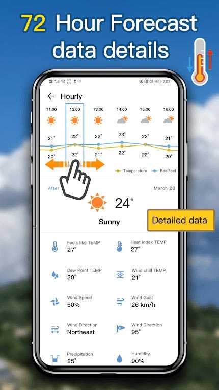 Прогноз погоды – это удобное мобильное приложение, в котором вы всегда можете узнать про актуальную климатическую обстановку в нужном регионе. Здесь на одном экране собрана наиболее точная статистика метеорологической информации. Программа имеет широкий функционал, который можно настраивать под ваши нужды. Смотрите почасовой и ежедневный прогнозы, чтобы быть в курсе погоды за окном и оптимально планировать свой день. Выбирайте нужный виджет и устанавливайте его на экран.