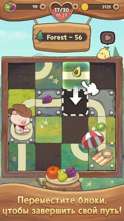 Пикник Слайди Пикник – это незатейливая мобильная головоломка, в которой вам предстоит перемещать блоки для восстановления пути. Милый поросенок готов двигаться к очередной карте – нужно лишь составить для него верный путь из предложенных элементов. Несколько тысяч эпичных этапов ждет вас, выбирайте поросенка из массы предложенных вариантов и отправляйтесь в забавное приключение.