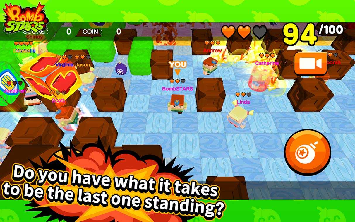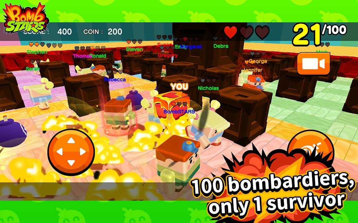 Bomb STARS – это динамичный мобильный экшен, в котором вас ждут ожесточенные схватки с другими игроками со всего мира в жанре королевской битвы. Куча бомб, взрывов, крутых героев и полей битв понравится всем любителям повоевать от души. Останьтесь последним из выживших игроков в бою, чтобы завоевать достойные призы и славу. На полученные в сражениях монеты вы сможете приобрести разнообразные скины для персонажей, мощные бомбы и классные эффекты взрывов.
