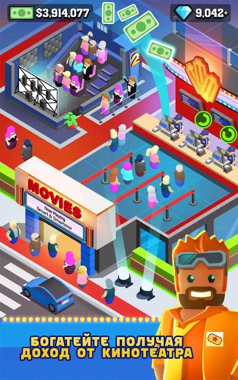 Box Office Tycoon – это забавный мобильный менеджер кинотеатра, в котором любой желающий может окунуться в атмосферу удивительного развлекательного заведения и изучить многие ее нюансы. Простая игра-кликер будет понятна даже начинающим пользователям. Здесь вы при должном усердии быстро разовьете свое дело и станете настоящим киномагнатом. Обустраивайте торговые точки, комнаты с игровыми автоматами, залы для посетителей и всячески улучшайте степень комфорта вашего кинотеатра.