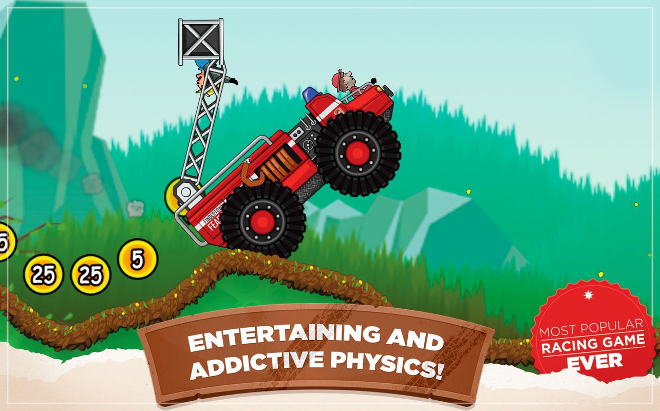 Hill Climb Racing – это легкая и веселая гонка для мобильных устройств, в которую всегда интересно играть. Здесь вы будете кататься на различных транспортных средствах по всевозможным локациям и зарабатывать золотые монеты. Выбор машин в игре просто огромен – сначала вам будут доступны обычные неулучшенные тачки с плохой скоростью и не всегда срабатывающими тормозами. По мере прохождения карт вы сможете модернизировать любой автомобиль и приобрести новые модели, включая луноход и даже рождественскую оленью упряжку.