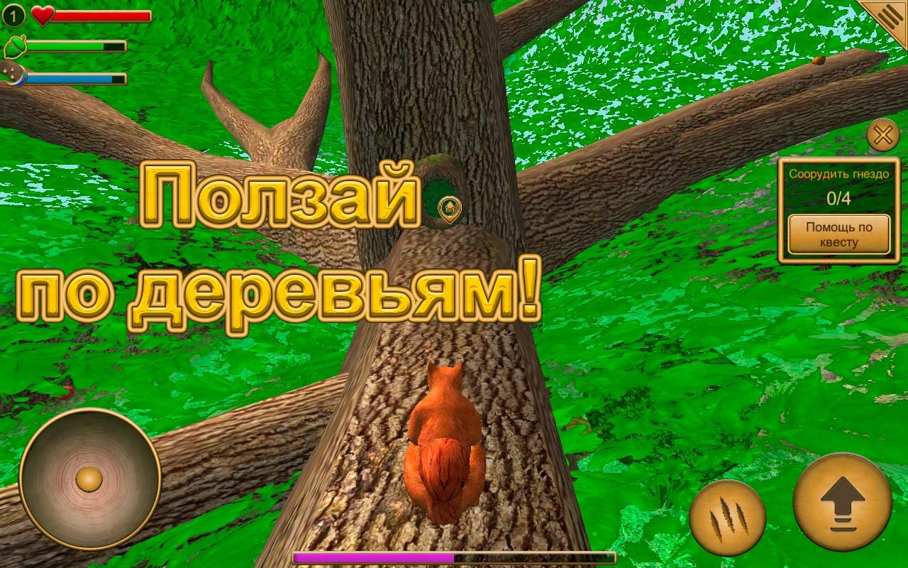 Симулятор белки – это еще и собственный дом. Найдите просторное дупло и сделайте в нем гнездо из веток. В своем доме можно спать и хранить запасы еды, здесь абсолютно безопасно и тепло. Спать также лучше в своем дупле – таким образом вы восстановите гораздо больше сил. Кстати, в этой игре можно иметь несколько домов и, соответственно, больше запасов и мест для комфортного отдыха.