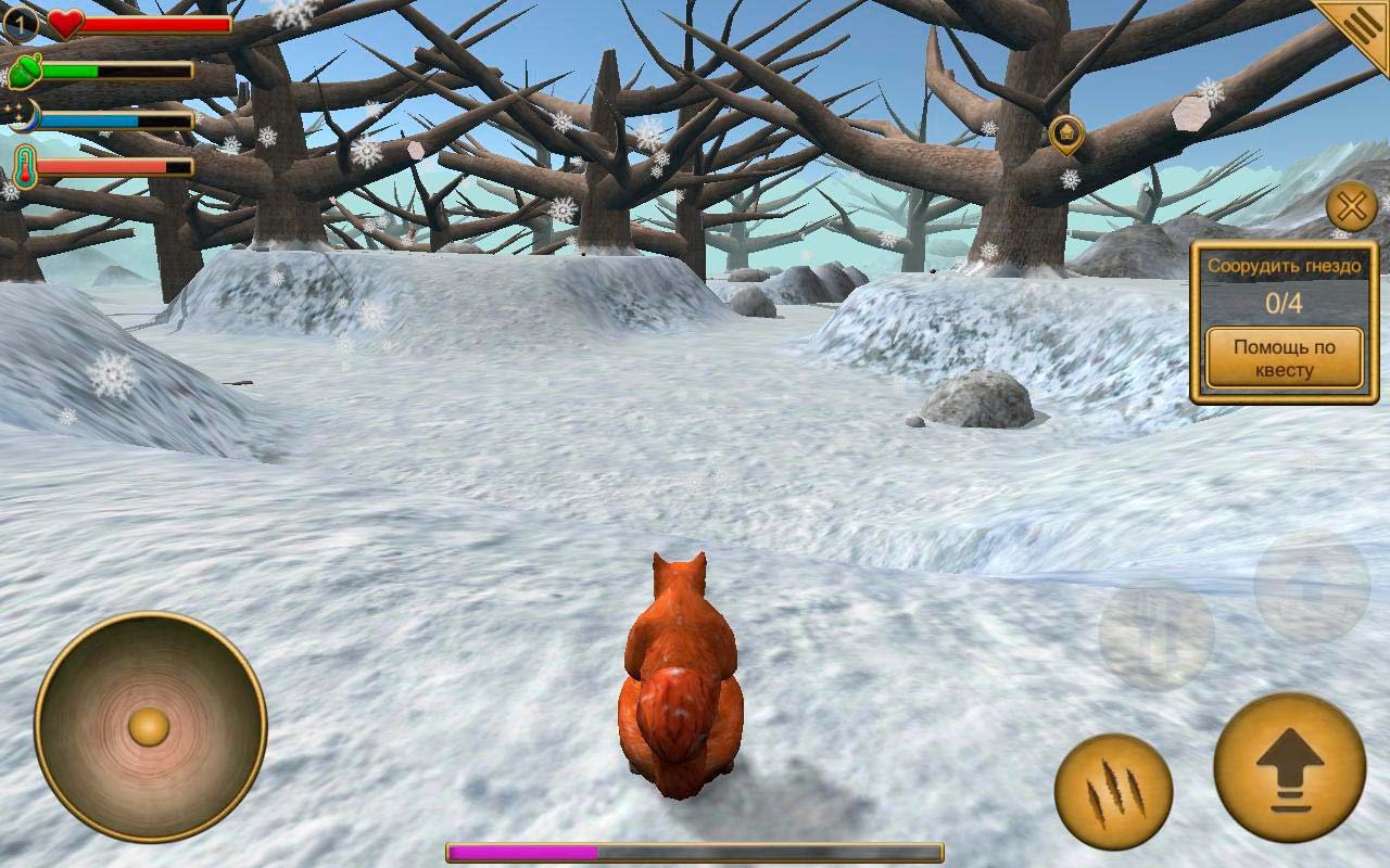 Еще одна серьезная угроза в игре Симулятор белки – холодная зима. Когда наступает это время года, добыть еду становится гораздо сложнее, а белка, находясь вне своего дома, постепенно замерзает. Чтобы выжить зимой, нужно подготовиться к ней основательно, собрав как можно больше еды про запас летом, когда желуди, ягоды и грибы попадаются на каждом шагу.