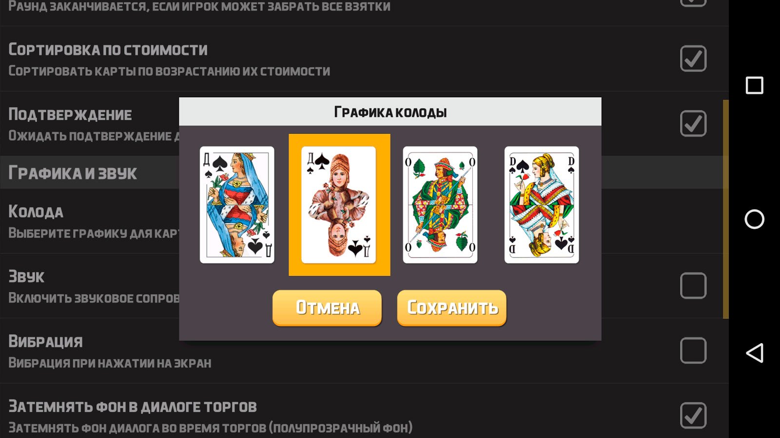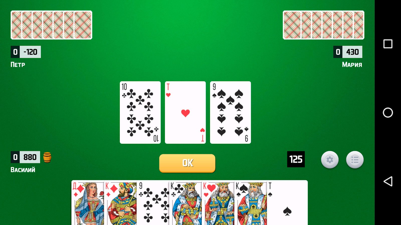Приложение имеет приятный интерфейс с возможностью выбора вида колоды карт, удобное управление и аутентичное звуковое сопровождение. Также вы сможете настроить приложение по своему вкусу и выбрать набор договоренностей, чтобы сделать партии гораздо интереснее.