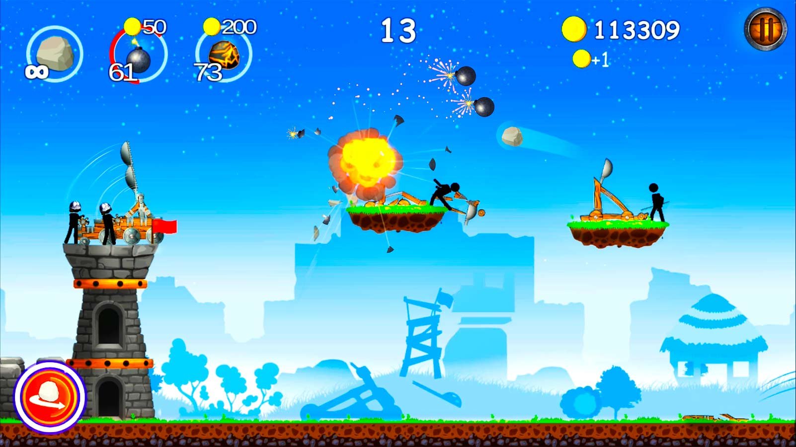 Выбирайте Стикмена и приступайте к организации защиты собственной башни, чтобы выиграть это сражение придется проделать очень много работы. Попробуйте скачать The Catapult на андроид и воспользуйтесь катапультой, чтобы все это совершить. Первым делом вам придется заниматься строительством башни и крепости и постараться сделать ее очень крепкой и надежной. Поставьте как можно больше орудия для метания, чтобы отбиваться от нападающих на вас Стикменов, и вы должны будете добиться лучших результатов в этом деле. Устраняйте как можно больше противников, чтобы выиграть и стать лучшим.