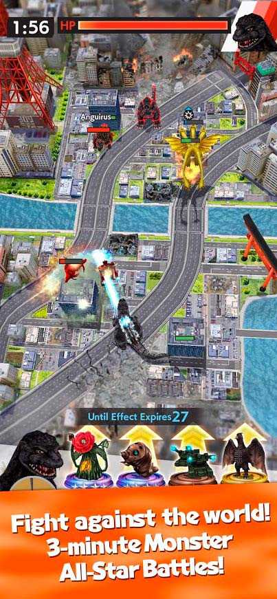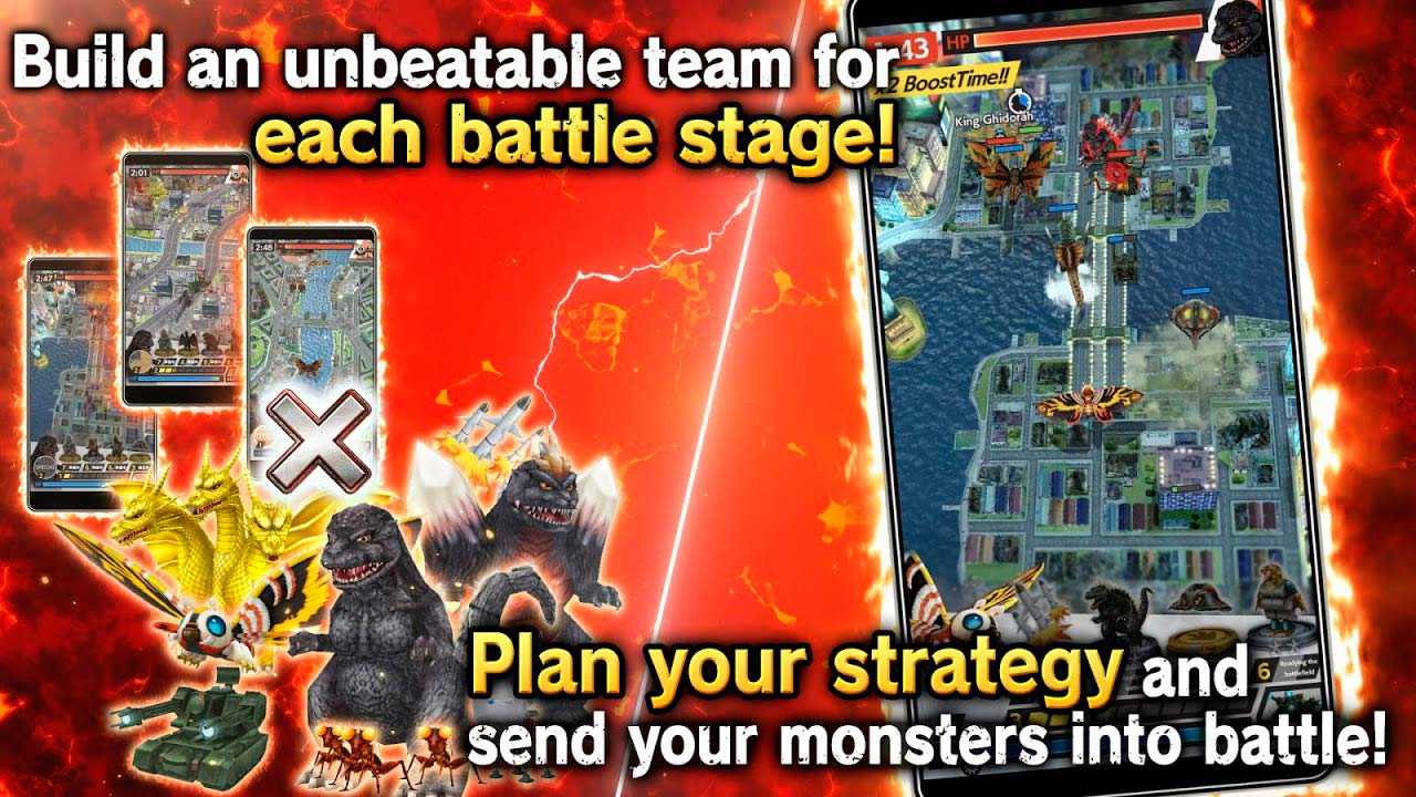 GODZILLA BATTLE LINE – это эффектные битвы гигантских монстров у вас на ладони. Создайте команду из могучих чудовищ и отправляйтесь на динамичные трехминутные сражения. Знакомые многим по фильмам про Годзиллу гиганты готовы ринуться в бой под вашим командованием – распланируйте стратегию и начинайте скоростные масштабные баталии. За победы вы будете получать специальные карты острова монстров, исследовав которые можно найти новые виды чудовищ.