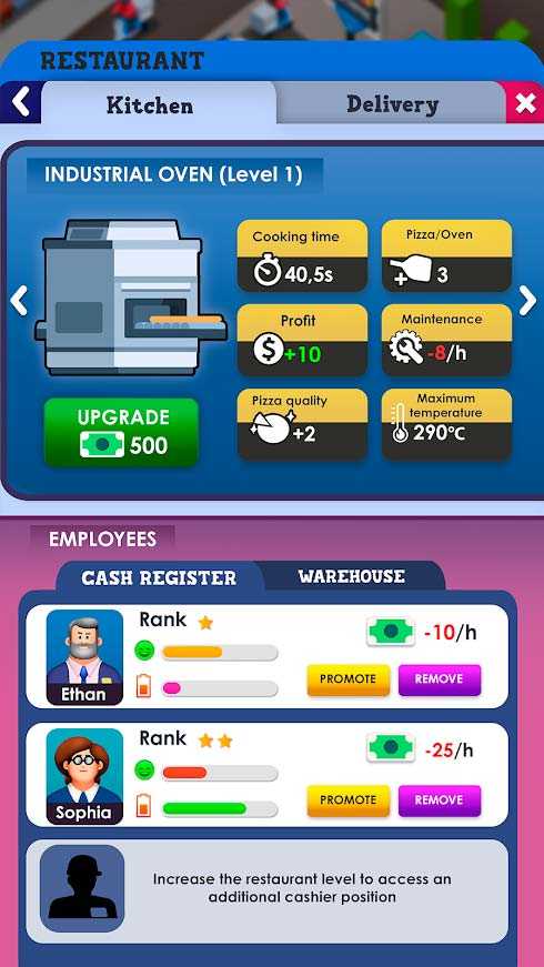 Pizza Empire Tycoon – это увлекательный симулятор пиццерии, в котором вам предстоит строить целую бизнес-империю. Начинайте с небольшого ресторанчика и вкладывайтесь в развитие своего дела, чтобы расширить сеть и разрастись на весь мир. Ваши пиццерии должны быть самыми лучшими, поэтому стоит позаботиться о каждом аспекте работы: купите лучшую посуду, наймите квалифицированный персонал, создайте уют в помещениях и обслуживайте клиентов по высшему разряду.