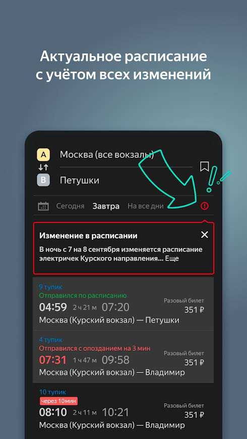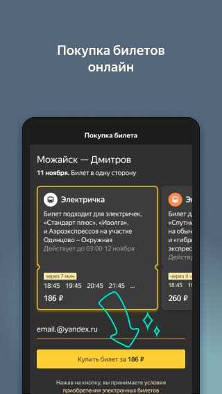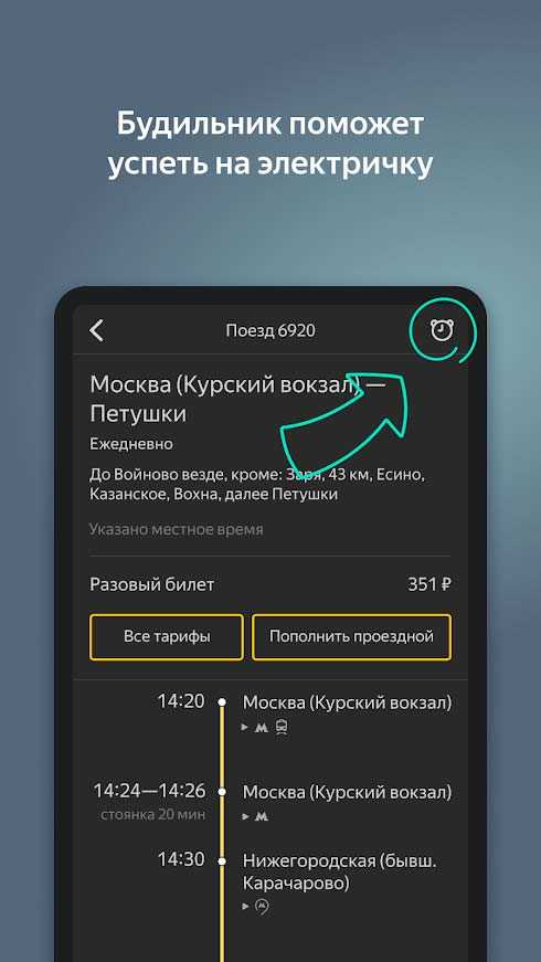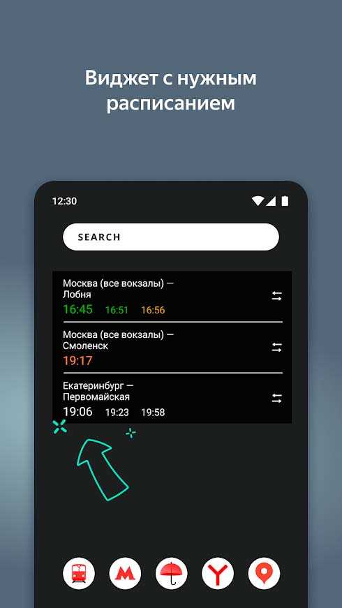 Яндекс.Электрички – это универсальное мобильное приложение для поиска билетов с широким набором полезных опций. Здесь вы всегда найдете актуальное расписание с учетом всех изменений, сможете настроить будильник, чтобы не пропустить маршрут и получите всю необходимую информацию о поездках. Выведите виджет с расписанием на экран телефона и будьте всегда в курсе движения электричек. Сохраняйте маршруты и переходите на другие услуги от Яндекса в одно нажатие.