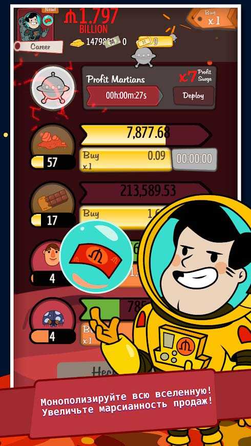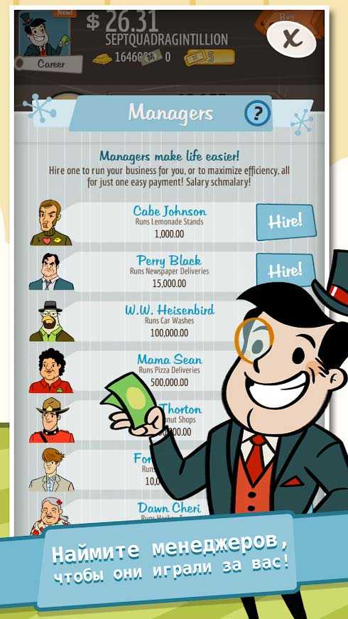 AdVenture Capitalist – это забавный симулятор капиталиста, в котором вы узнаете простую схему получения денег. Начинайте свой путь с продажи лимонада и развивайте бизнес, постепенно продвигаясь к креслу директора международной компании, зарабатывающей огромные деньги. Наймите менеджеров, получите инвестиции, купите все необходимое и еще больше увеличьте прибыль.