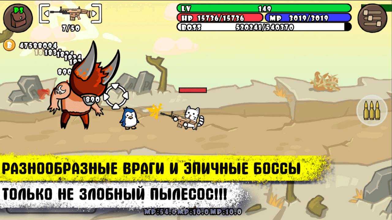 Война Котов Оффлайн – это крутая мобильная стрелялка, для которой не нужно подключение к интернету. В образе бесстрашного кота отправляйтесь покорять страшных мутантов и эпичных боссов. Прокачивайте своего героя, делайте его сильнее и наслаждайтесь удивительным приключением. Сотни уникальных локаций и закрученных миссий ждут всех любителей отлично повеселиться и от души пострелять.