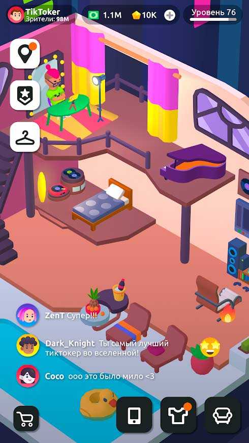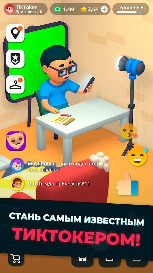 Idle Tiktoker – это крутой мобильный симулятор тиктокера, в котором вы сможете стать настоящей звездой. Разбогатейте на своей популярности, записывая видео и показывая их всему миру. Развивайте канал, набирайте подписчиков и становитесь все известнее. Лишь самые яркие и запоминающиеся личности смогут пробраться в топ тиктокеров и занять там верхние места – постарайтесь стать одним из них.