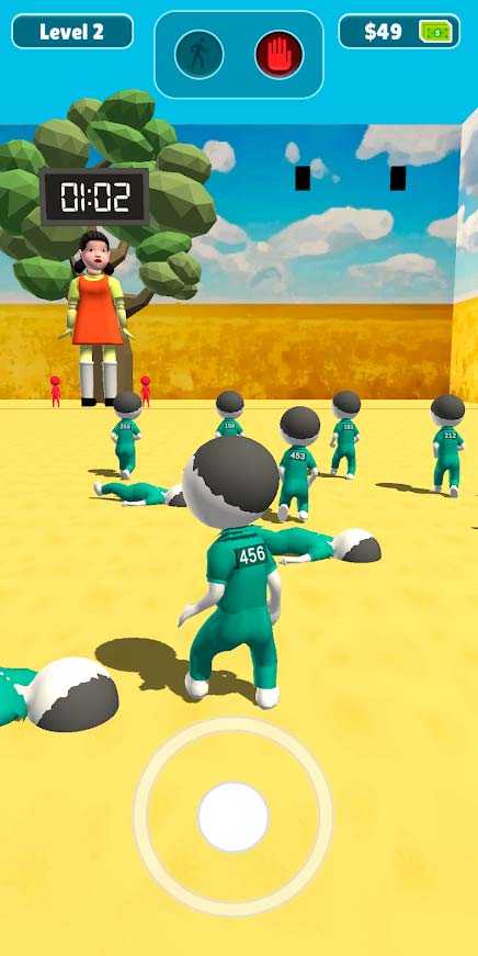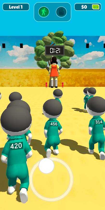 Игра в Кальмара 3D – это яркая мобильная аркада, созданная фанатами одноименного сериала. Попробуйте добежать до финиша, играя в простую детскую игру со смертоносными взрослыми правилами. Двигайтесь только в определенное время, иначе вы будете уничтожены. За вами наблюдает внимательная кукла, и от ее взора не ускользнет никто. С такой игрой вы не только отлично проведете время, но и разовьете скорость реакции.