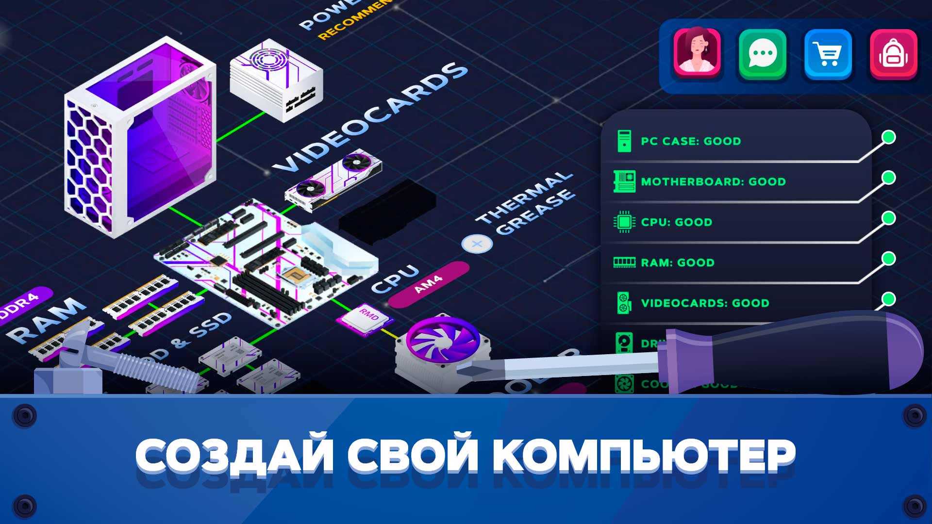 PC Creator 2 – это новая часть игры про сборку компьютеров, предлагающая вам стать магнатом IT-бизнеса. Оцените себя в роли владельца компьютерного магазина или запустите майнинг-ферму. Выполняйте разнообразные заказы клиентов и погружайтесь в мир технологий, становясь в нем настоящим мастером. С такой необычной игрой-симулятором замена детали в компьютере или установка программного обеспечения не покажутся вам скучным занятием. Красочная анимация игры создает незабываемую атмосферу, в которой можно провести долгие часы и отлично отдохнуть.