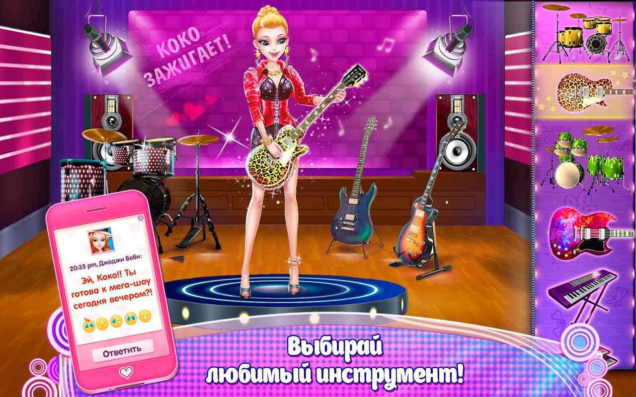 Рок-звезда Коко – это новая классная музыкальная игра, в которой любой сможет осуществить свою мечту о выступлениях на сцене перед многотысячной толпой. Вместе с Коко и ее музыкальной группой вы сможете испытать незабываемые эмоции. Покажите всем свой звездный стиль, выбирая собственный образ. Начните с прически и макияжа, подберите одежду и дополните образ подходящими аксессуарами. Меняйтесь и удивляйте фанатов, экспериментируйте и просто отдыхайте за отличной игрой.